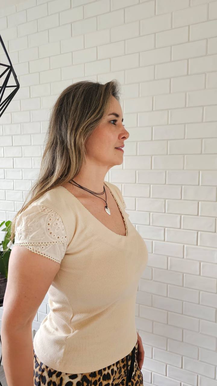 Blusa Dalia Arena: elegancia y comodidad en cada detalle. Confeccionada en suave tejido rib que abraza tu figura con delicadeza, esta prenda destaca por su romántico cuello en V adornado con fino bolillo. Las manguitas abullonadas, también terminadas en bolillo, añaden textura artesanal y un toque de encanto irresistible. Su versátil tono arena se adapta a cualquier estilo, convirtiéndola en la pieza perfecta para looks sofisticados y cómodos. Femenina, refinada y lista para cualquier ocasión.